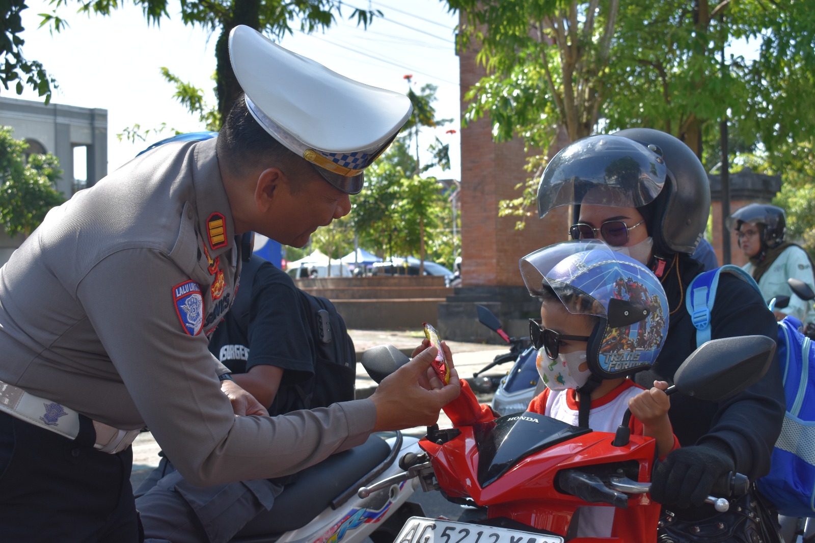 “Masih banyak kita temukan pengendara yang membonceng anak-anak tanpa helm. Ini tentu sangat riskan. Oleh sebab itu, hari ini kami turun ke jalan. Kita berikan pemahaman dan edukasi dengan membagikan kurang lebih 50 helm dewasa dan anak-anak.” Ujarnya.
