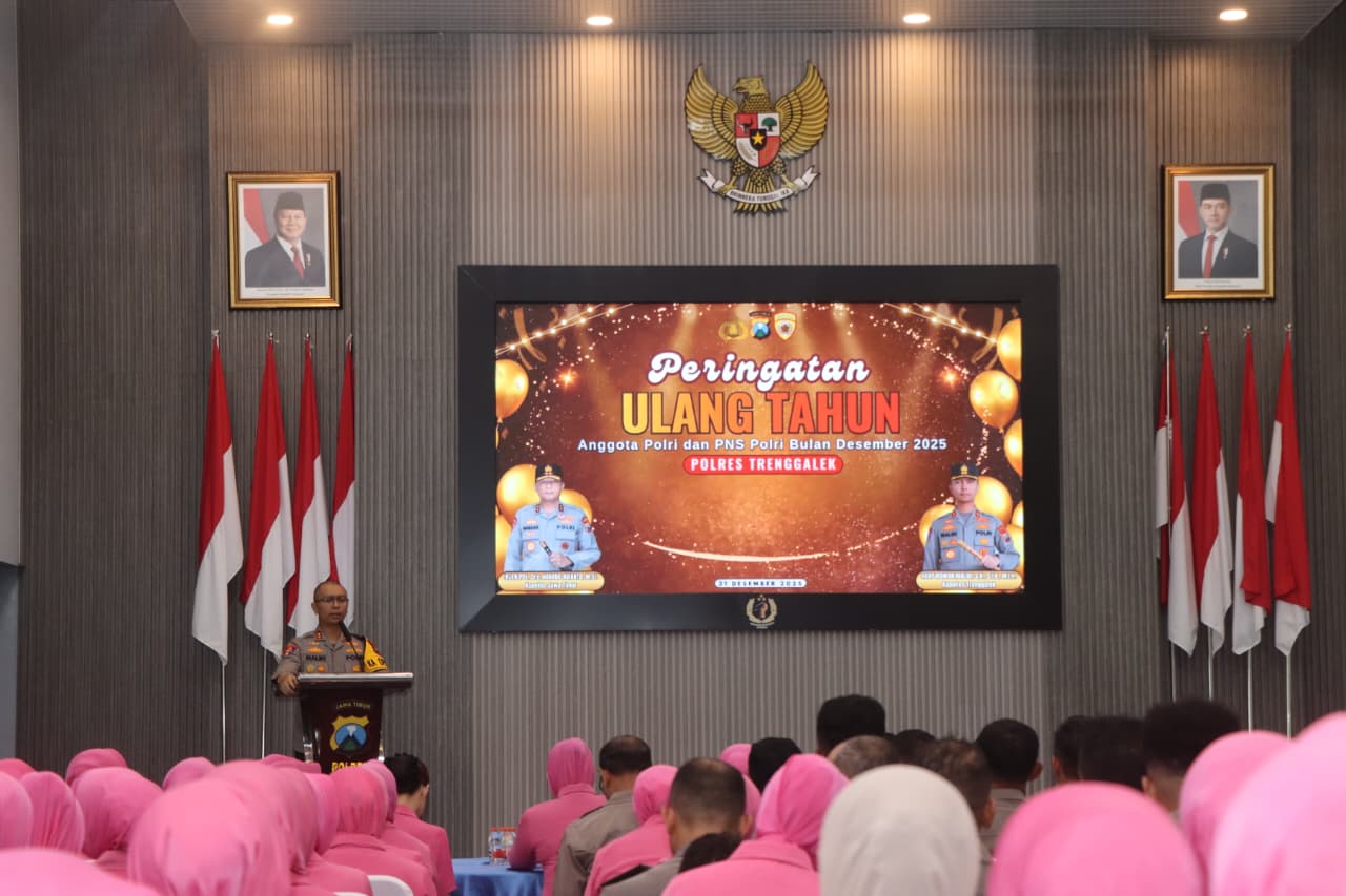 Polres Trenggalek – Kepala Kepolisian Resor Trenggalek AKBP Ridwan Maliki, S.H., S.I.K., M.I.K. memotong tumpeng ulang tahun bagi puluhan anggotanya. Acara tasyakuran yang mengambil tempat di aula Tatag Trawang Tungga ini digelar bersamaan dengan tasyakuran anggota yang menerima anugerah kenaikan pangkat reguler perode 1 Januari 2026. Rabu, (31/12).